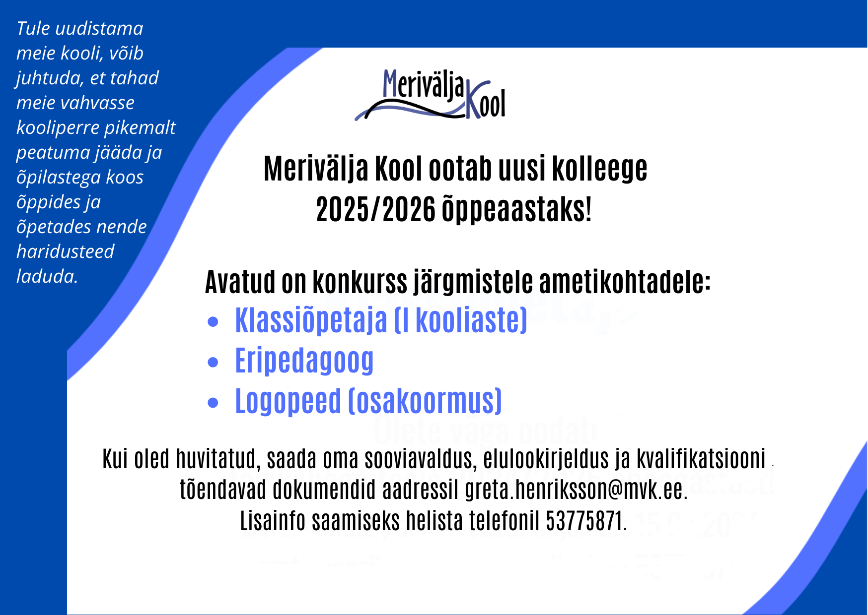 MVK advendikohvikud 2025 Loomise kuupäev 26.11.2025 Autor MVK Teaduskooli ajaloovõistlus MAMMUT Loomise kuupäev 26.11.2025 Autor MVK Merivälja Kooli meeskond osaleb Arukate Õpilaste Akadeemias Loomise kuupäev 03.11.2025 Autor MVK Üheksandad klassid Proto keskuses Loomise kuupäev 17.10.2025 Autor MVK Vaata rohkem
