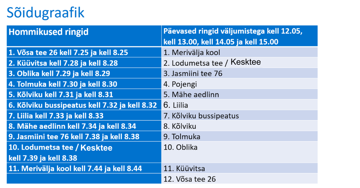 Sõiduplaani koostamisel arvestati sel hooajal kevadel lastevanematelt saadud tagasisidega ning ajagraafikuid ja peatusi kohandati vastavalt laste elukohtadele.