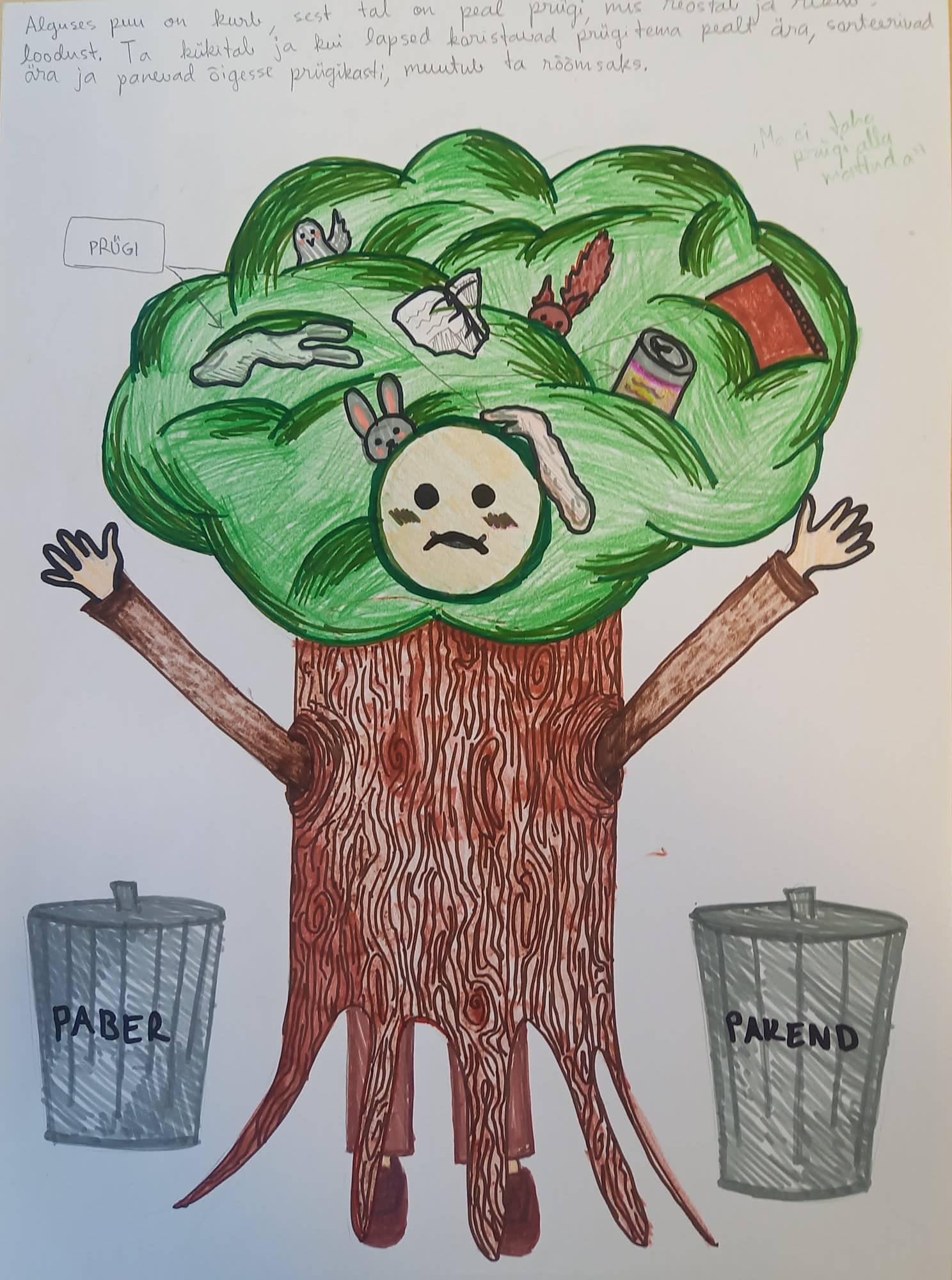 Kauri töö on heatahtlik roheline ussike. Mariette töö on südamekujuline puuleht. Elizabethi töö on prügi koristamisele kaasa aitav puu, pildi kõrval on huvitav tekst tema nägemusest.
