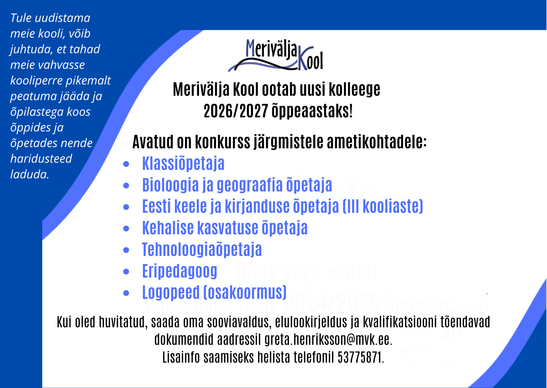 Forus hakkab avalikku korda valvama ka Merivälja asumis Loomise kuupäev 15.04.2026 Autor MVK 2.B klassi kevade saabumise tervitus Loomise kuupäev 24.03.2026 Autor MVK MVK Hoolimise kuu Merivälja Koolis Loomise kuupäev 02.03.2026 Autor MVK Vabariigi aastapäev 2026 Loomise kuupäev 21.02.2026 Autor MVK Vaata rohkem