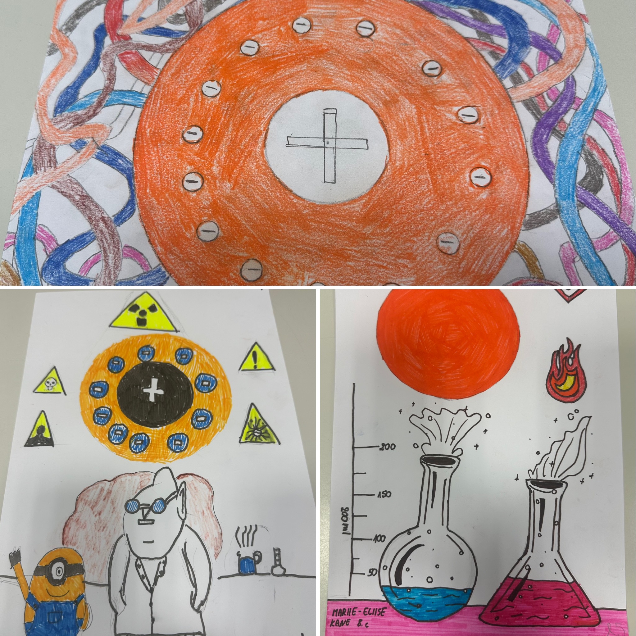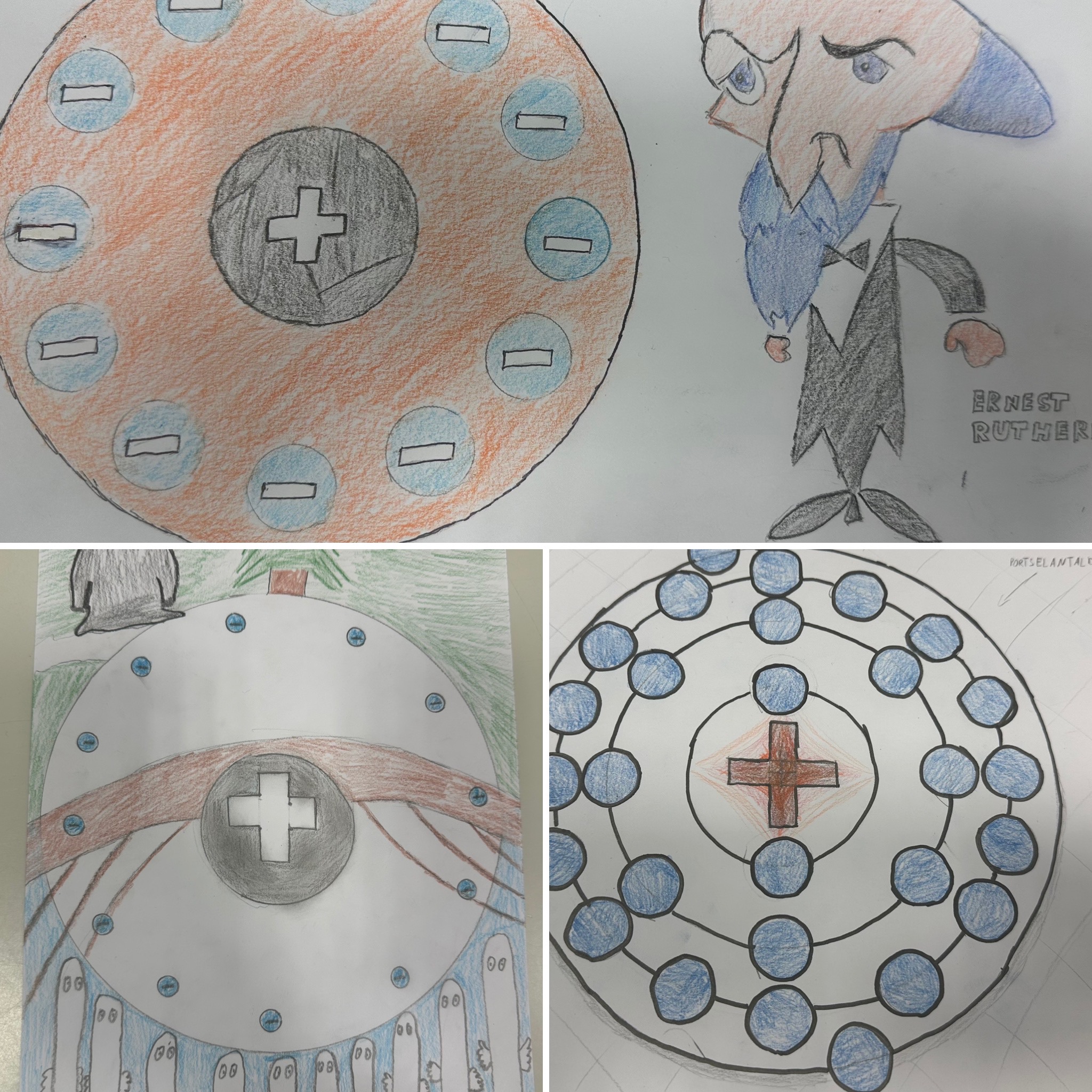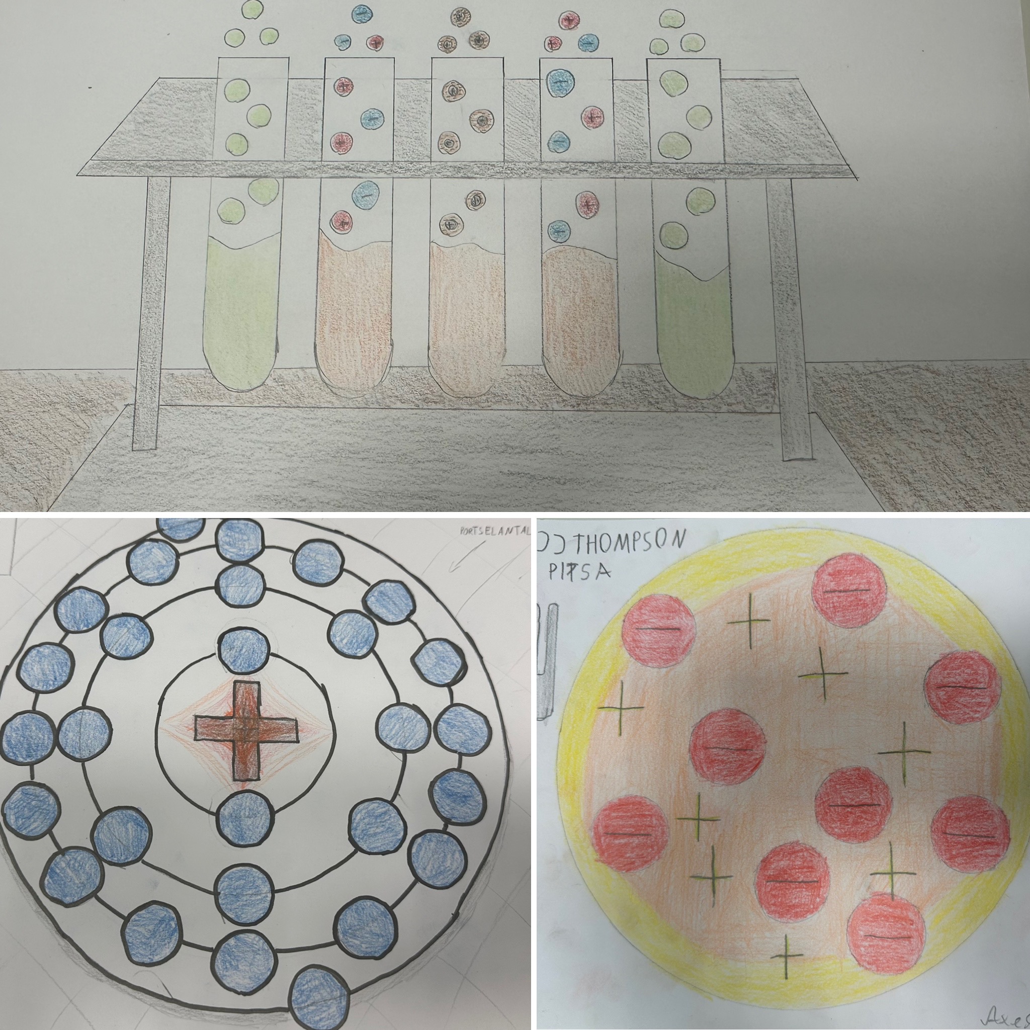 Õpilased olid just keemiatunnis aatomi mudeli ehitust õppinud. Keemiaõpetaja jagas ka lingid erinevatest aatomi mudelite kujutamisvõimalustest õpilastele SMART tahvlile kuvamiseks. Ülesanne- tuleb teha huvitav kunstiteos, mille üks osa on tõepäraselt kujutatud aatomimudel, mis võib pildis olla esitatud ka peidetuna või humoorikas võtmes. Õpilastele oli selline ülesanne alguses üllatav, kuid samas tundus see neile põneva väljakutsena. Nad ise väga nautisid tulemust, mis polnud lihtsalt kätte tulnud. Samas on õpilased aastate vältel harjunud kunstiõpetaja Tarve õpetamisstiiliga ja teavad, et ülesandeid on kahte tüüpi: tehnilised, mis on täpsed ja konkreetsed, kus õpitakse uusi konkreetseid töövõtteid. Teisalt on loovülesanded, kus õpilastel on väga suur vabadus kasutada kõiki oma häid loovaid ideid. Tööd on nüüd labori kõrval koolimaja B majas üleval. Lisatud on ka pisike info aatomimudeli arengu kohta, mis oli antud töö inspiratsiooniks. Tulemused rõõmustasid kõiki tööde autoreid ja loodetavasti ka vaatajaid. Aitäh õpilased ja teie juhendajad õp Liivi ja Tiina